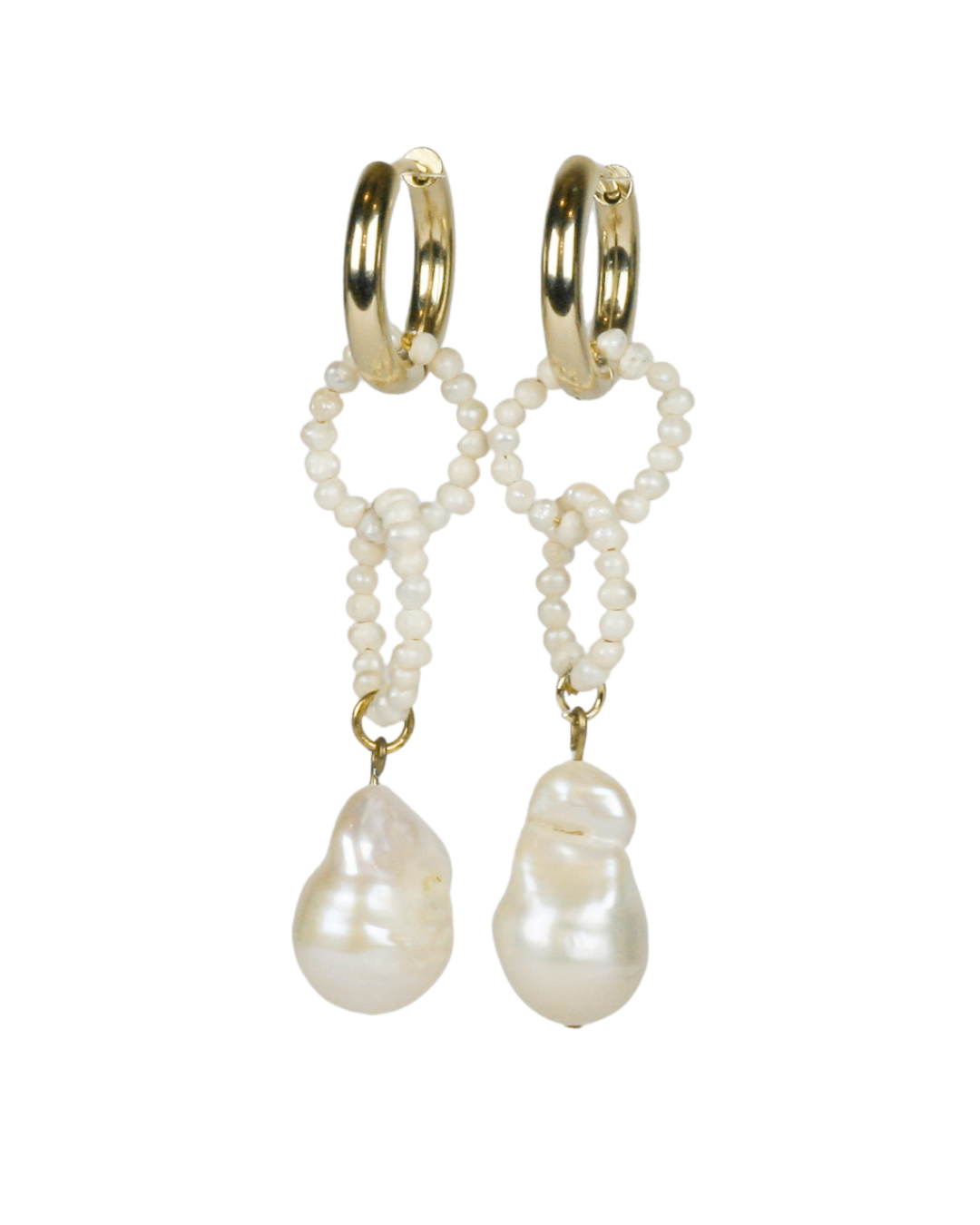 Bold yet refined, these baroque pearl earrings are designed as modern statement pieces with timeless appeal. A polished gold-plated stainless steel hoop anchors cascading white beads, shimmering crystal accents and a luminous baroque freshwater pearl. The sculptural drop silhouette adds movement and presence, while maintaining a clean, contemporary look.